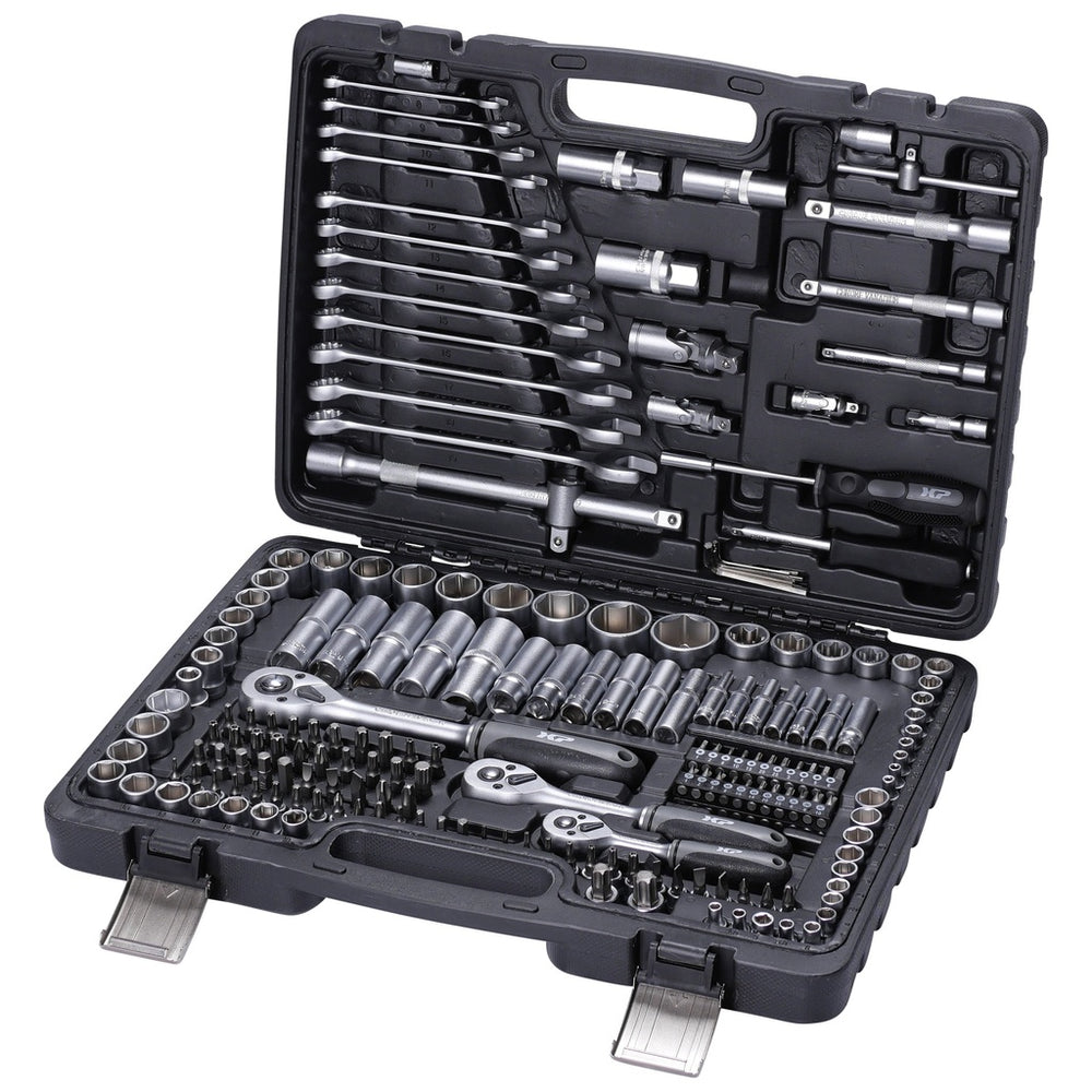 Deze gereedschapset van XPTools bestaat uit 3 complete dopsleutelsets voor alle gangbare projecten_ 1/4", 3/8" en 1/2" aansluiting; 12 combinatiesleutels, 7 inbuszeskantsleutels.
