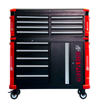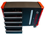 Mat zwarte afwerking met rode accenten: De gereedschapswagen heeft een mat zwarte afwerking met opvallende rode accenten, wat zorgt voor een professionele uitstraling.