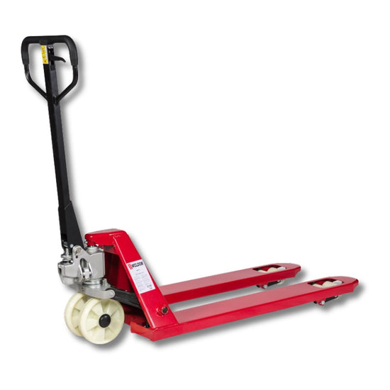 De palletwagen 3.000 kg is voorzien van nylon stuur- en vorkwielen, die uitstekend presteren op harde ondergronden en geschikt zijn voor buitengebruik. Deze wielen zijn bestand tegen zuren, bieden een lichte loop en zorgen voor optimale prestaties onder zware belasting.