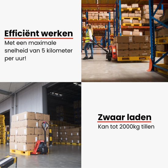 Ben je op zoek naar een efficiënte en betrouwbare oplossing voor het verplaatsen van zware pallets? Bij Schutte Trading vind je de Weldon Elektrische Pompwagen 2000kg: de perfecte combinatie van kracht, gebruiksgemak en betaalbaarheid. Met een robuust hefvermogen, compacte afmetingen en een krachtige lithium-ion batterij is deze elektrische palletwagen ideaal voor magazijnen, winkels en vrachtwagens.