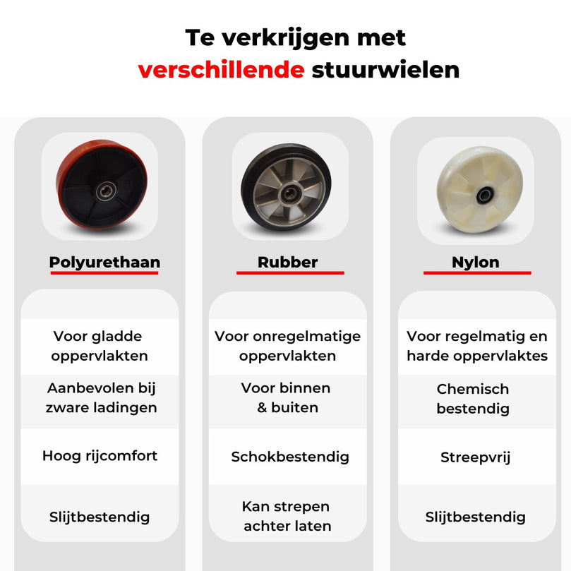 De Weldon Palletwagen 2500KG is verkrijgbaar met verschillende wielopties, afgestemd op jouw werkvloer: