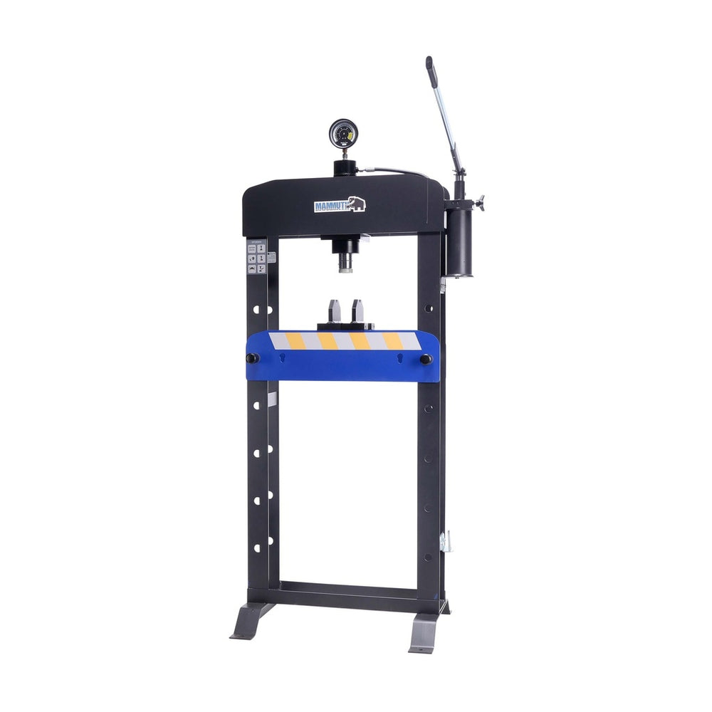 Deze Mammuth pers is uitermate geschikt voor het monteren van lagers, het inpersen van assen en bouten, het buigen van buizen en andere pers werkzaamheden waarbij grote kracht vereist is. De pers heeft een volledig gelast solide frame. Op de manometer kan duidelijk de persdruk in kilogram afgelezen worden. De hydraulische cilinder is voorzien van een verwisselbare opname perskop en geïntegreerde hydraulische tweetrapspomp. Dit ingebouwde tweetraps systeem zorgt voor een grote slag bij lage tegendruk en een kleine controleerbare slag bij een hogere tegendruk, pers werkzaamheden kunnen zo gemakkelijk nauwkeurig uitgevoerd worden.